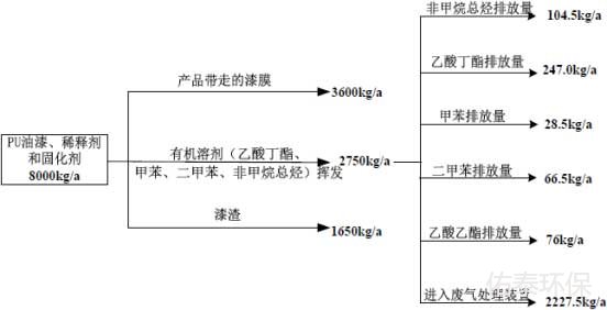 達(dá)產(chǎn)情況下PU油漆年用量為5t、稀釋劑年用量為1t、固化劑年用量為2t,按含量計(jì)算易揮發(fā)物質(zhì)非甲烷總烴0.550t/a、乙酸丁酯1.30t/a、甲苯0.150t/a、二甲苯0.350t/a、乙酸乙酯0.40t/a,其他為樹脂等固化劑。根據(jù)噴油漆涂料用量核算表(表2-4),噴漆進(jìn)入產(chǎn)品的量為3.600t/a。PU油漆、稀釋劑和固化劑物料平衡情況見圖2-1。