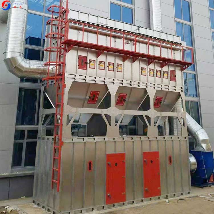 該除塵器采用國(guó)際流行的托里特沉流式除塵器結(jié)構(gòu)與"唐納森"除塵器構(gòu)一致,并且濾筒可以互換,即可配用美國(guó)唐納森濾筒,也可配用國(guó)產(chǎn)濾筒。濾芯排列結(jié)構(gòu)布局合理,橫向組合安裝,且為上進(jìn)風(fēng)、下排風(fēng)、高壓脈沖氣動(dòng)反吹清灰,除塵效果好;該結(jié)構(gòu)有利于含塵氣體導(dǎo)入除塵器室內(nèi)各濾筒載體,均勻分布,也利于反吹清灰瞬間被彈落的灰塵下落,減少二次吸附的可能性;下排風(fēng)結(jié)構(gòu),直接導(dǎo)入風(fēng)機(jī),風(fēng)機(jī)電機(jī)為落地式,增強(qiáng)設(shè)備的穩(wěn)定性,又能節(jié)省管路聯(lián)接所帶來(lái)的沒(méi)必要的浪費(fèi)。