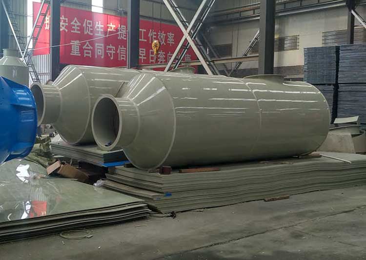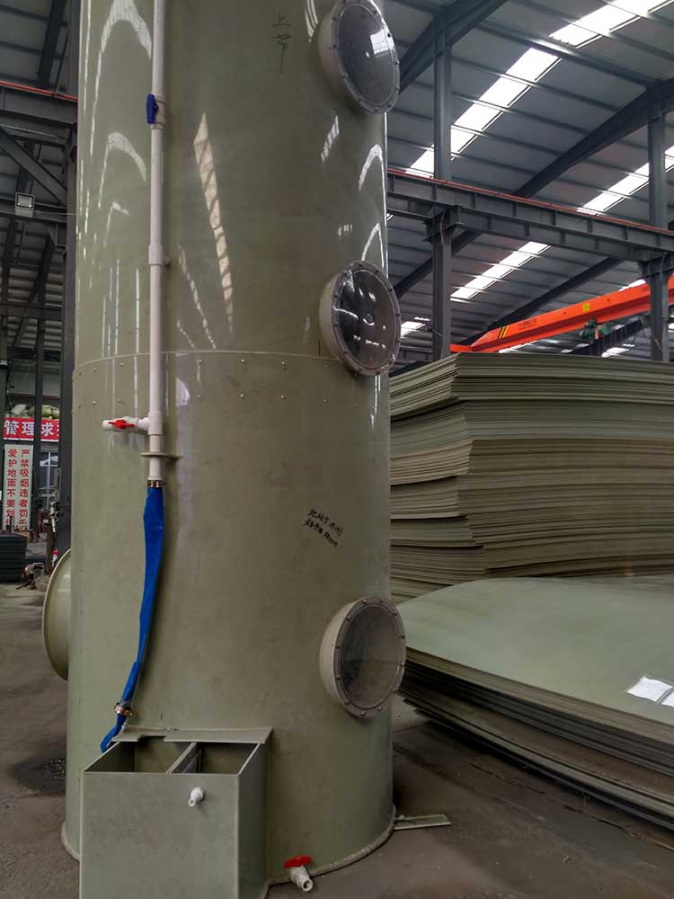 1.5萬風(fēng)量酸霧凈化塔規(guī)格為:ф1.8m*H4.0m*10mm。進(jìn)、出風(fēng)口直徑均為600mm。循環(huán)水量每小時22立方。每小時處理廢氣量16800立方。凈化塔整體厚度為10mm PP板。