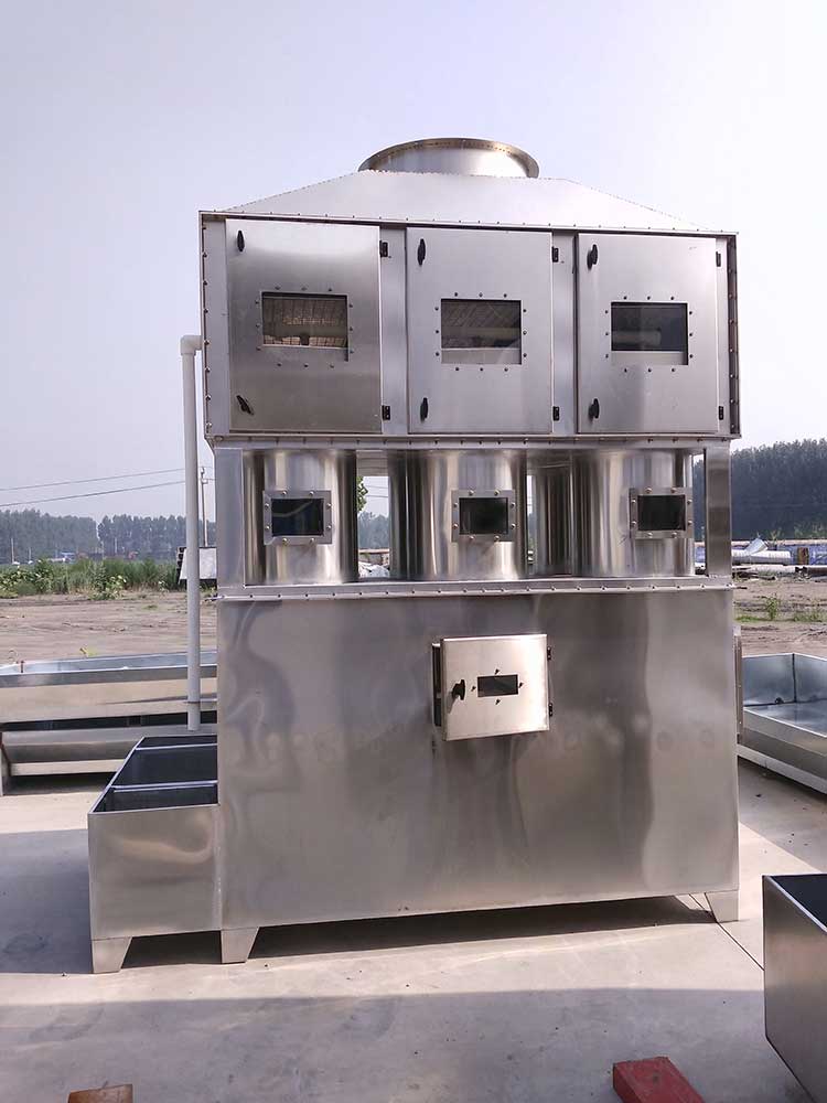 一、旋流脫硫塔工作時含塵廢氣由風管引入旋流塔內,經過旋轉洗滌桶風帶加快,帶動填料球飛帶運轉,在洗滌桶里,含塵廢氣與水霧充分混合洗滌、中和反應(水里面補充有酸堿時),廢氣經過凈化后,再經除霧層脫水除霧后由風機排入大氣或再進入其他凈化設備(光氧催化設備、活性炭吸附箱催化燃燒裝置等),吸收液在塔底經水泵增壓后在箱頂噴淋霧化而下,回流至箱底循環(huán)使用。