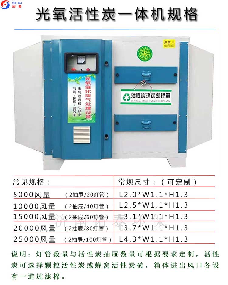 四、佑泰環(huán)保光氧活性炭一體機配置如下:(活性炭抽屜數(shù)與光氧燈管數(shù)可以按要求增減)