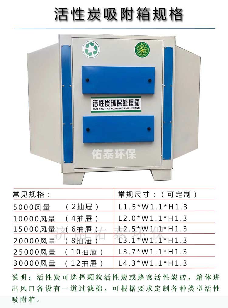 活性炭環(huán)保吸附箱根據(jù)風量不同,匹配相應的活性炭環(huán)保箱,常見的型號如下所示??梢愿鶕?jù)客戶的要求定制。